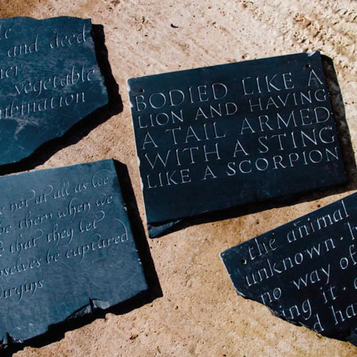 Primarily carved in stone, this takes the form of a natural history collection called Natural History: The Broom Cupboard. The title refers to a notional broom cupboard in a cognitive house, and it stores the indeterminate things that are not easily categorised or else somehow, misfiled. I decided to look at natural history because of precedents for natural history collecting, and a tendency for most collections to display a story . Also because of a history of taxonomic confuse, and misinformation.